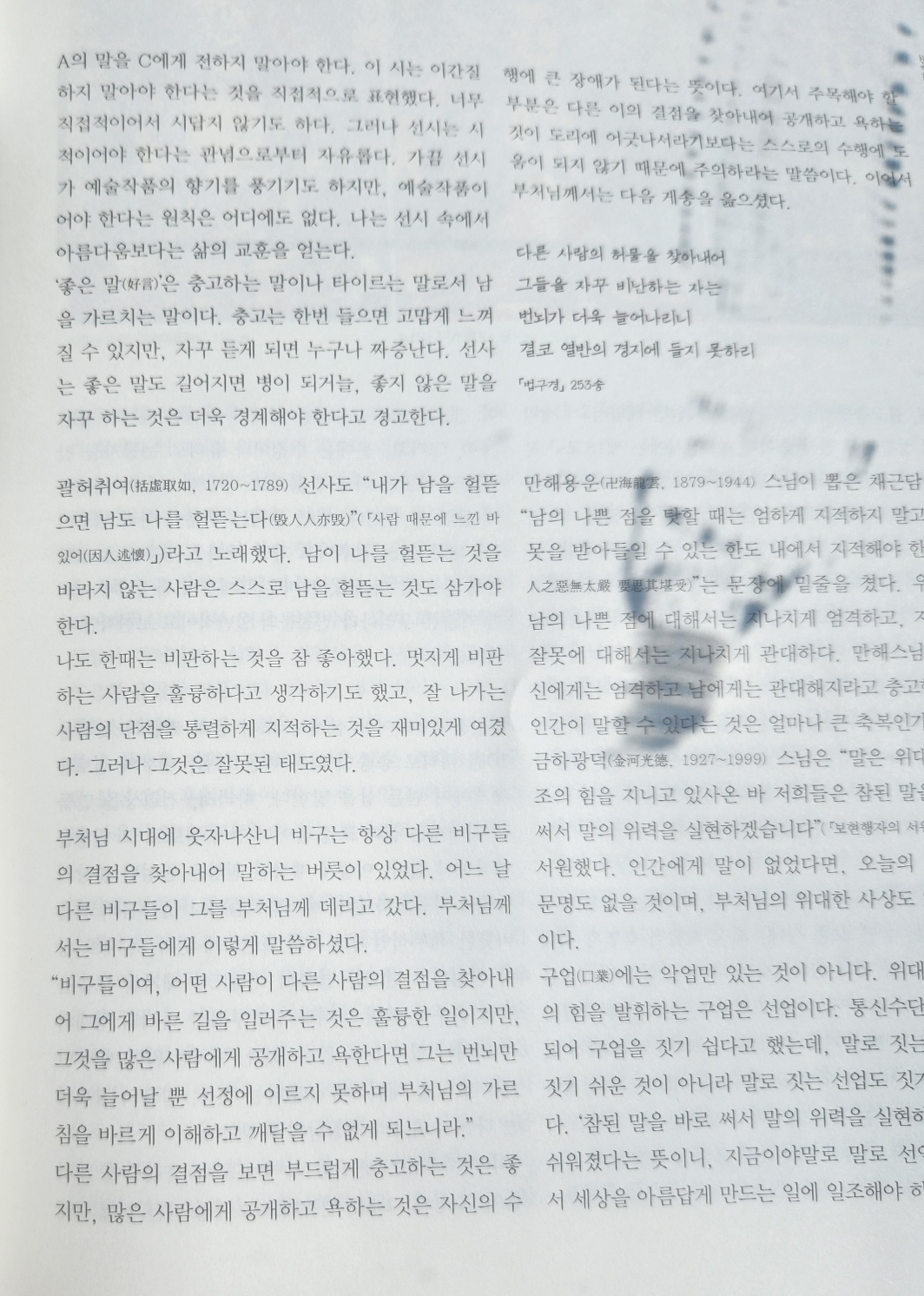 "여기서 주목해야 할 부분은 다른 이의 결점을 찾아내어 공개하고 욕하는 것이 도리에 어긋나서라기보다는 스스로의 수행에 도움이 되지 않기 때문에 주의하라는 말씀이다."